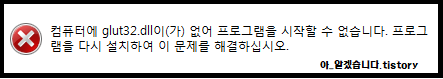 해당메세지는 glut32.dll파일이 없어서 나타나는 메세지로 glut32파일을 다운받아주면 해결됩니다