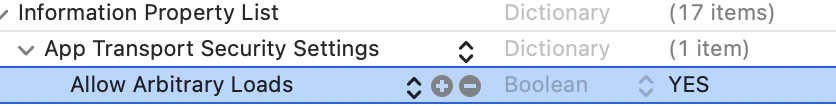 4) Allow Arbitrary Loads를 추가하고 값은 YES로 설정