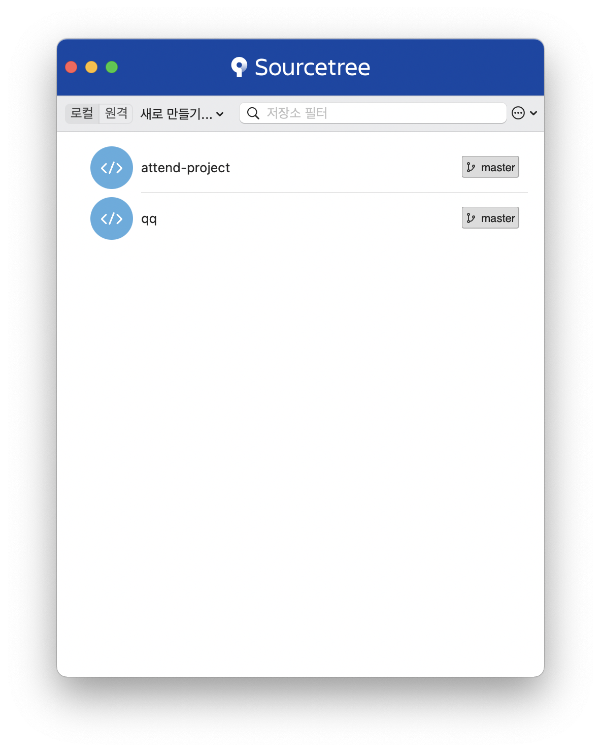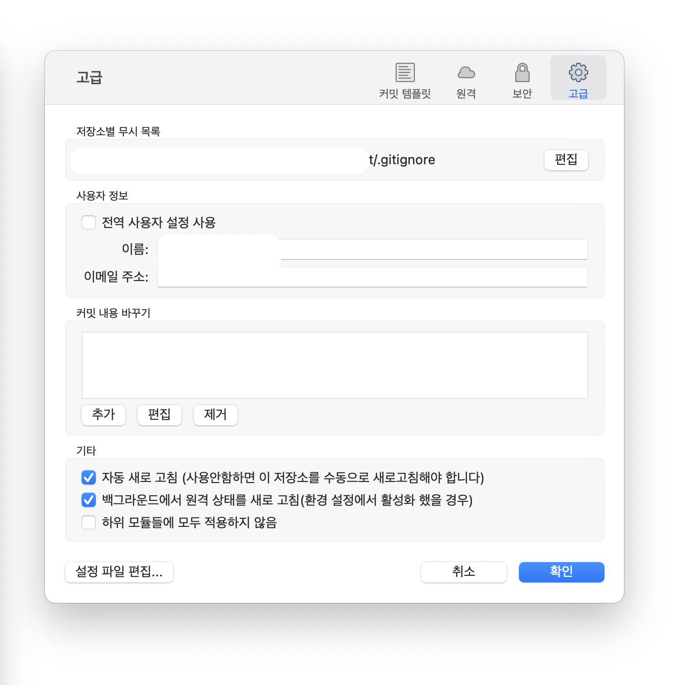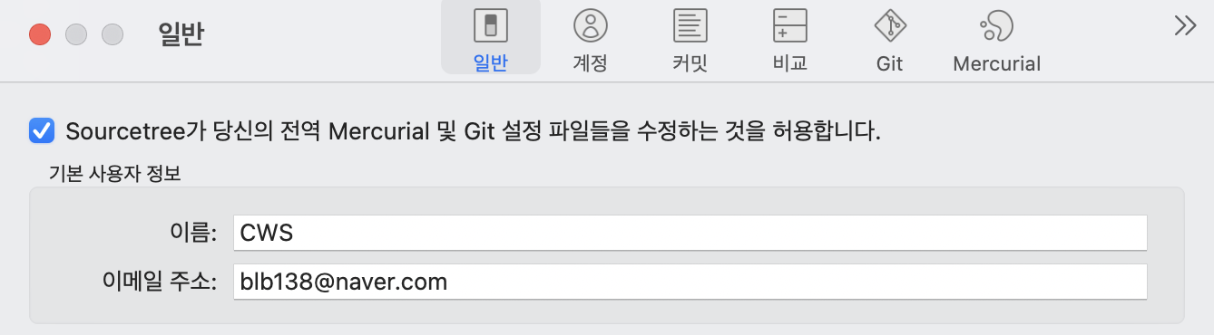 먼저 소스트리 초기화면에서 cmd + , 버튼으로 설정화면을 띄웁니다.