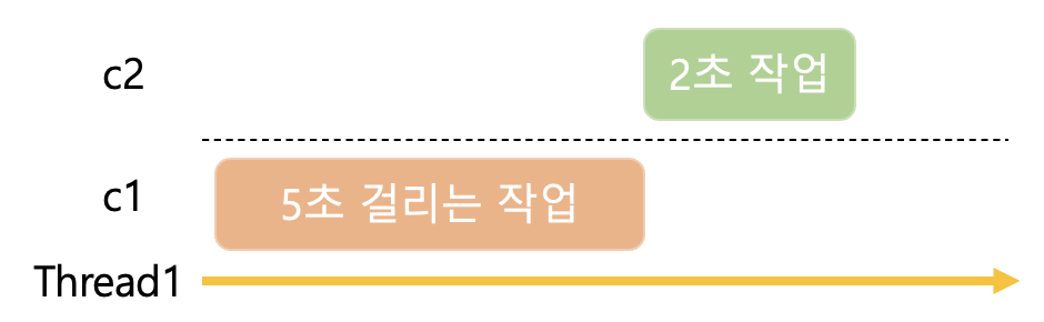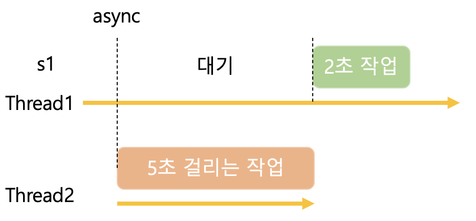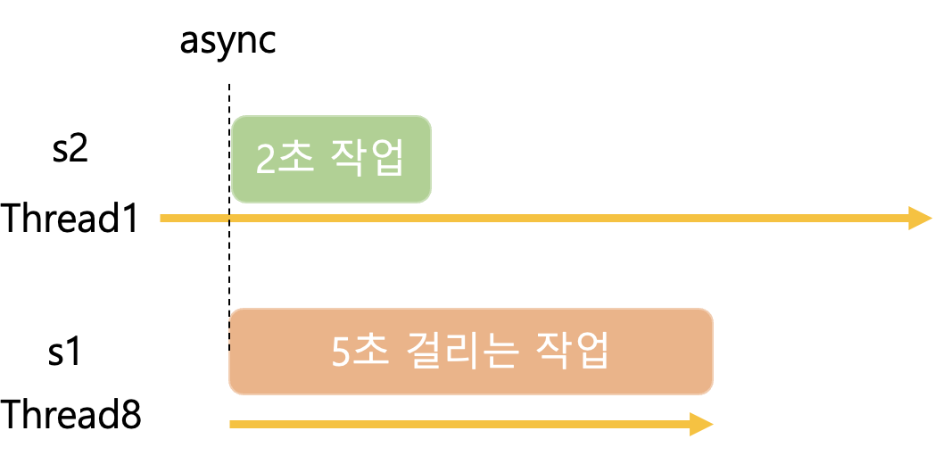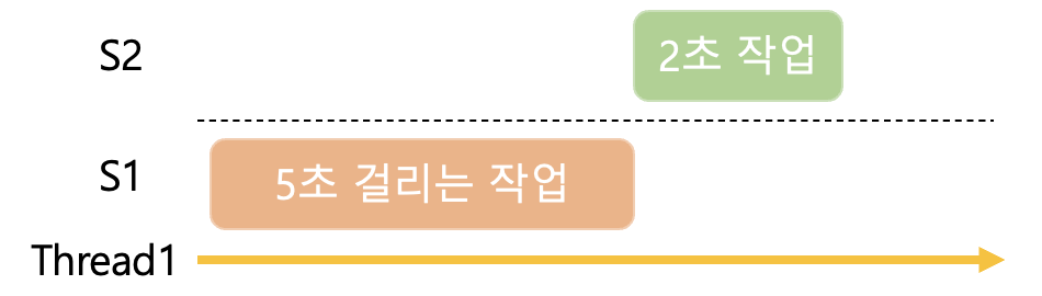 1.현재 쓰레드는 s1큐에 5초짜리 작업을 넣음 + Task 수행