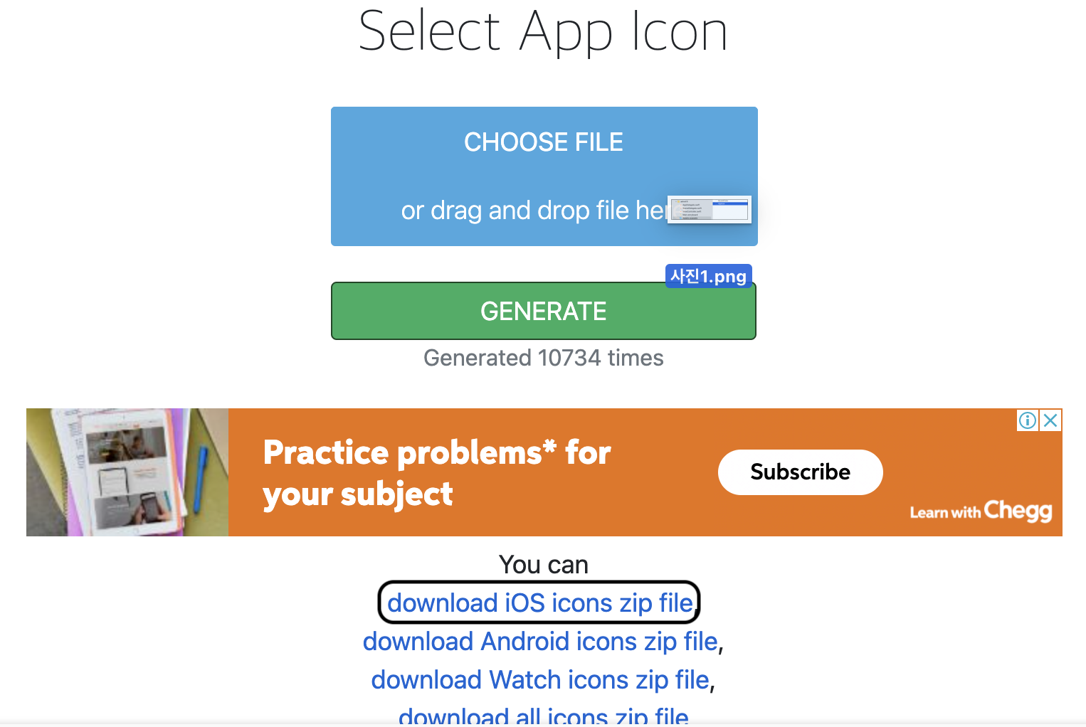 드래그로 사진은 업로드하고 generate를 한 후 본인이 필요한 icon사이즈를 클릭해 다운받으면 됩니다
